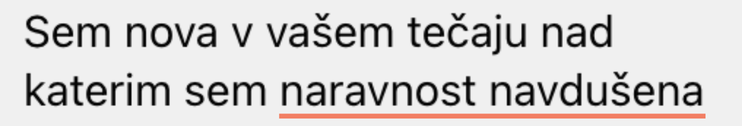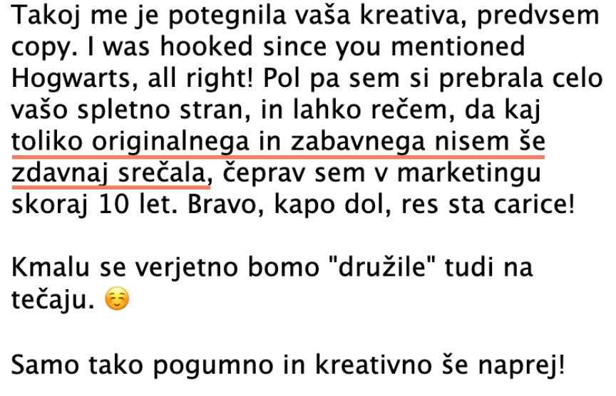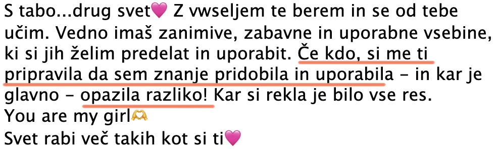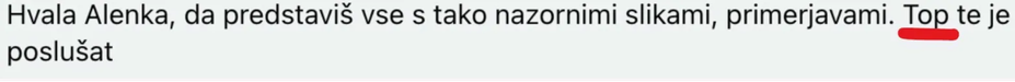 Kar hočem povedat… Cd bi se desetkrat poslusala webinar in se tri dni pisala, ne bi ratalo tole, kar je ratalo tebi.”