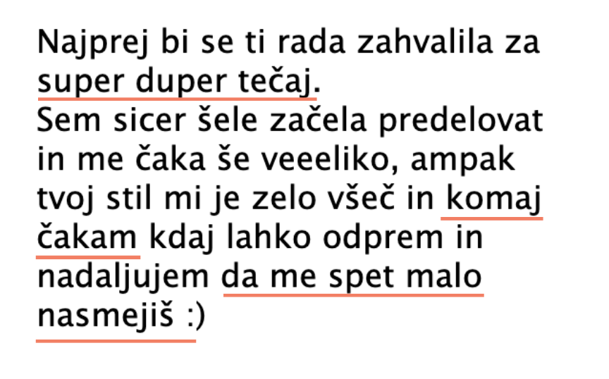 Točno ti pokažem, kje si “zabluzila” v pridigo in kje si bralca spustila iz rok. Preuredim tvoj ritem, da tvoj tekst dobi “kul vibe”, ampak ostane 100 % tvoj.