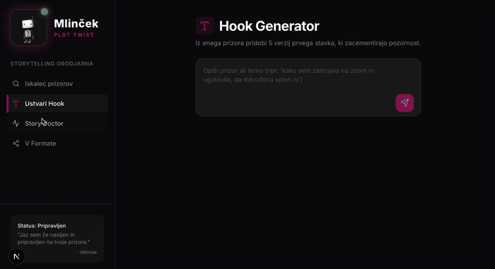 Zato imaš Mlinček App, pa še AI agenta, Story Finder, Hook Generator in Story Doctor - tvoja varnostna mreža, ko zmrzneš pred praznim ekranom. Samo vprašaš in dobiš strukturo nazaj.