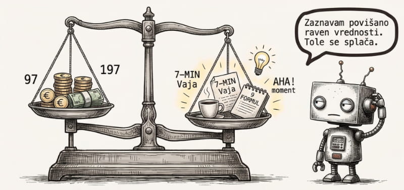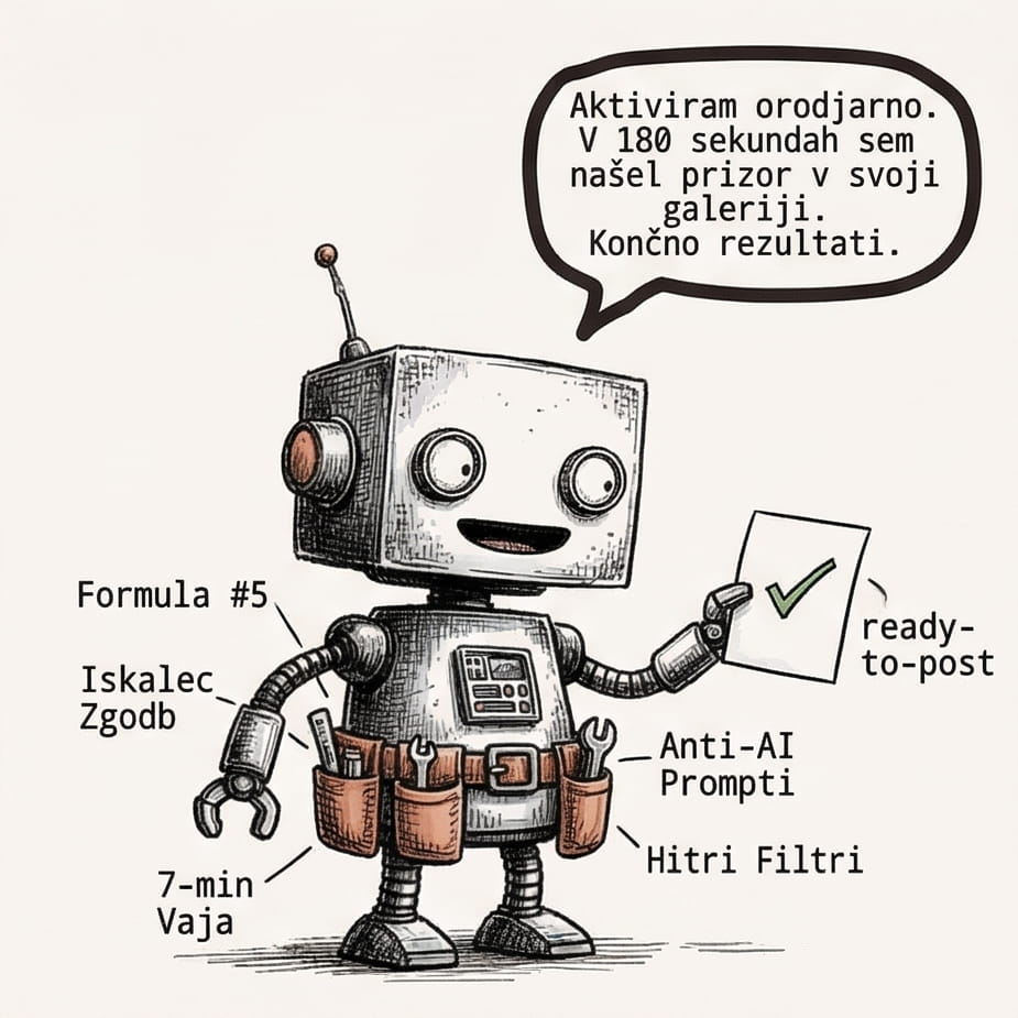 Plus: imaš posnetek delavnice in vse prompt kartice. Sistem je narejen tako, da dela brez "navdiha dneva".